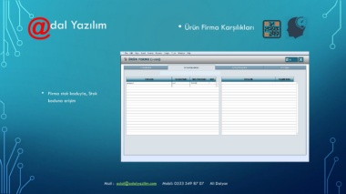 @ • Ürün Firma Karşılıkları dal Yazılım • Firma stok koduyla, Stok koduna erişim Mail : adal@adalyazilim.com Mobil: 0533 549 87 07 Ali Dalyan