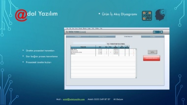 @ • Ürün İş Akış Diyagramı dal Yazılım • Üretim prosesleri tanımları • Dar boğaz proses tanımlama • Prosesteki üretim hızları Mail : adal@adalyazilim.com Mobil: 0533 549 87 07 Ali Dalyan