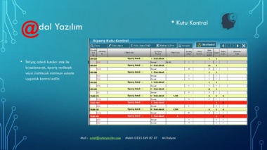 @ • Kutu Kontrol dal Yazılım • İhtiyaç adedi kutular stok ile kıyaslanarak, sipariş verilecek veya üretilecek minimum adede uygunluk kontrol edilir. Mail : adal@adalyazilim.com Mobil: 0533 549 87 07 Ali Dalyan