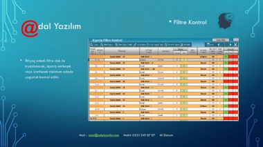@ • Filtre Kontrol dal Yazılım • İhtiyaç adedi filtre stok ile kıyaslanarak, sipariş verilecek veya üretilecek minimum adede uygunluk kontrol edilir. Mail : adal@adalyazilim.com Mobil: 0533 549 87 07 Ali Dalyan