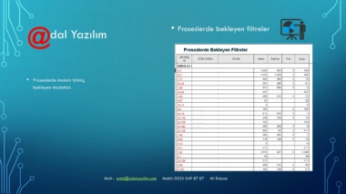 @ • Proseslerde bekleyen filtreler dal Yazılım • Proseslerde imalatı bitmiş, bekleyen imalatlar. Mail : adal@adalyazilim.com Mobil: 0533 549 87 07 Ali Dalyan